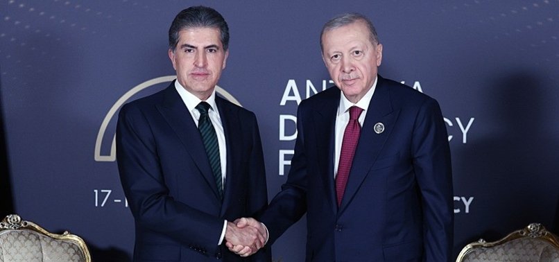 Turkish President Recep Tayyip Erdoğan on Saturday received Iraq’s Kurdish Regional Government (KRG) President Nechirvan Barzani on the sidelines of the Antalya Diplomacy Forum 2026 in southern Türkiye.