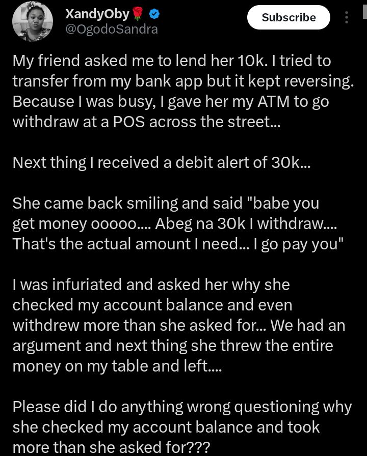 A lady is questioning her own judgment after a friend she tried to help with a ₦10,000 loan secretly checked her account balance and withdrew ₦30,000 instead.