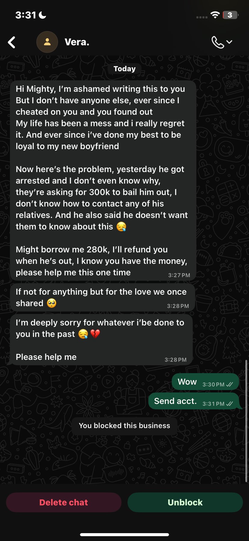 Second time, I broke up with you immediately i found out and we went our separate ways, after then you text me randomly begging for money, I’ll send to you