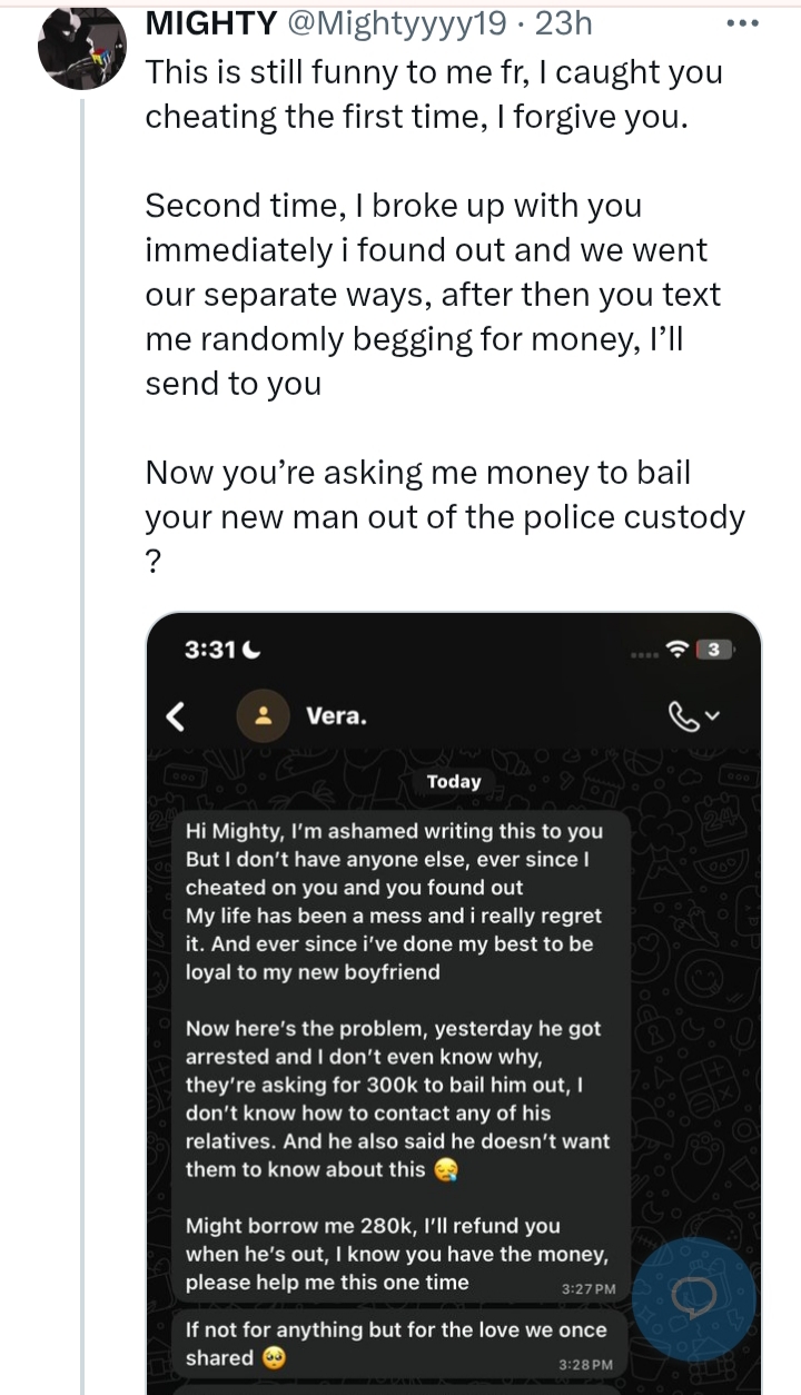 A man has shared an encounter with his ex-girlfriend, who reached out to him for financial help despite their troubled past.