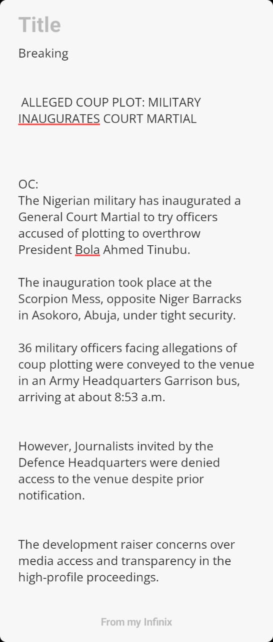 The Nigerian military has inaugurated a General Court Martial to try officers accused of plotting to overthrow President Bola Ahmed Tinubu.