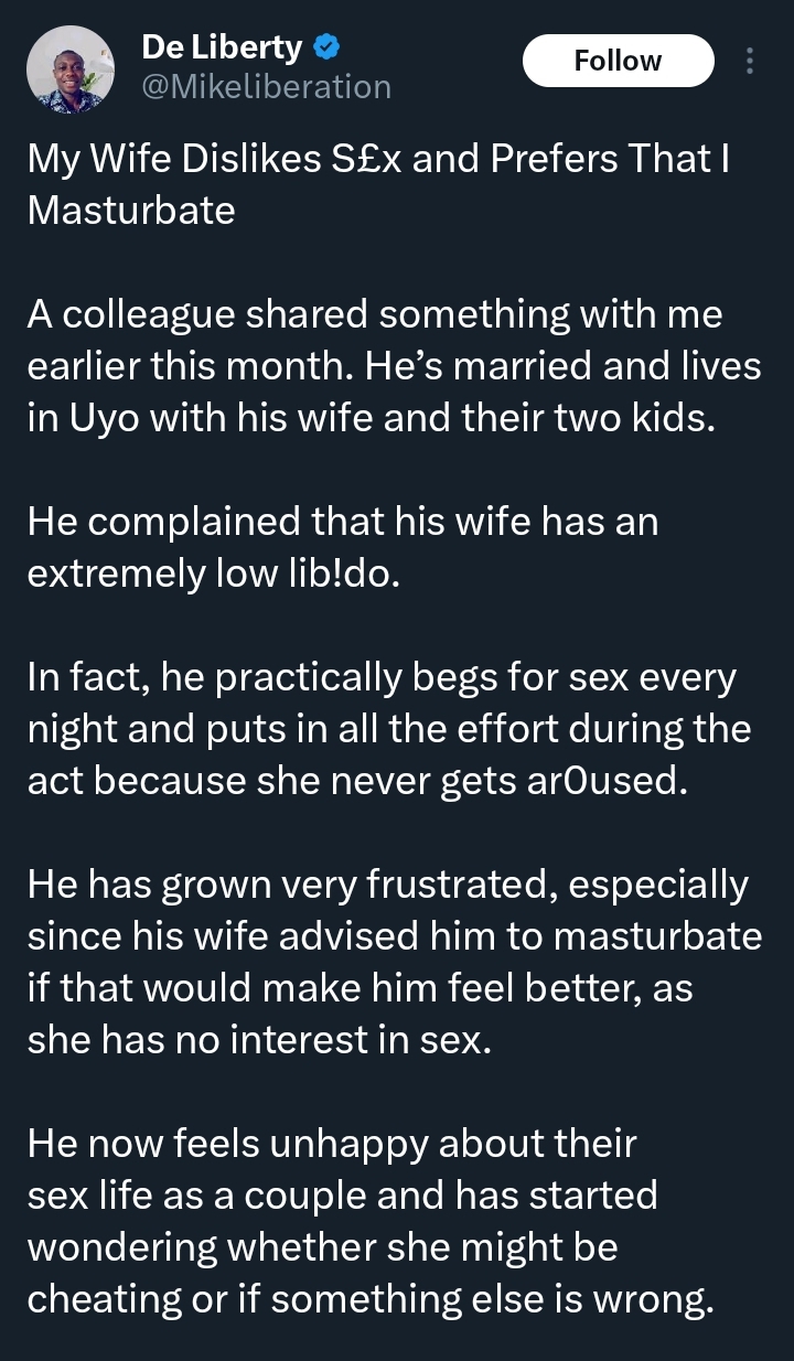 According to him, the colleague is battling frustration due to a lack of physical intimacy in the marriage.