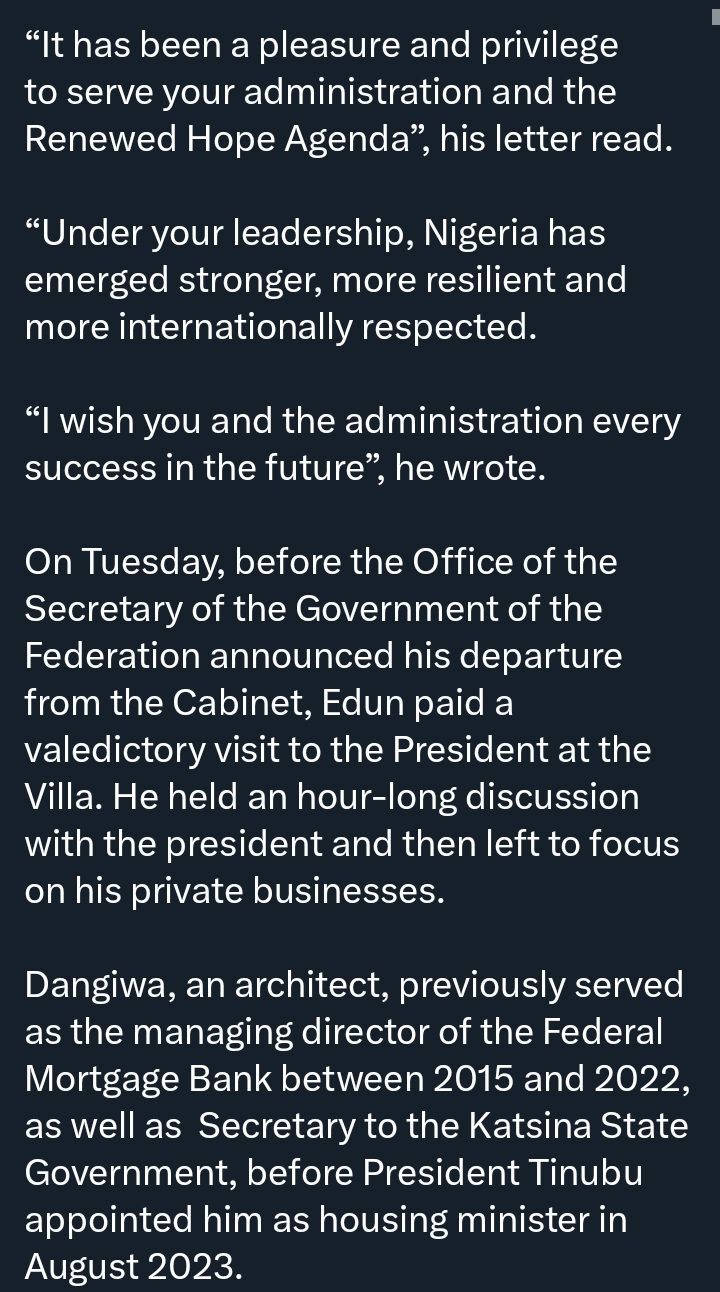 Similarly, Dangiwa resigned from his role as Minister of Housing and Urban Development, thanking the President for the chance to serve in the Federal Executive Council.