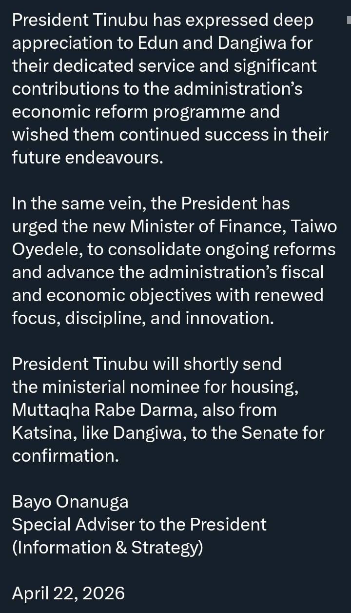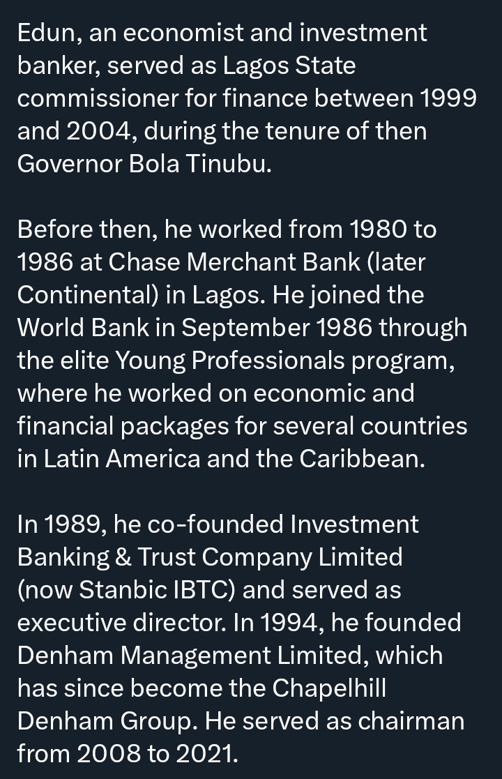 In his resignation letter, Edun expressed gratitude to the President for the opportunity to serve, describing his time in office as both a privilege and an honour.